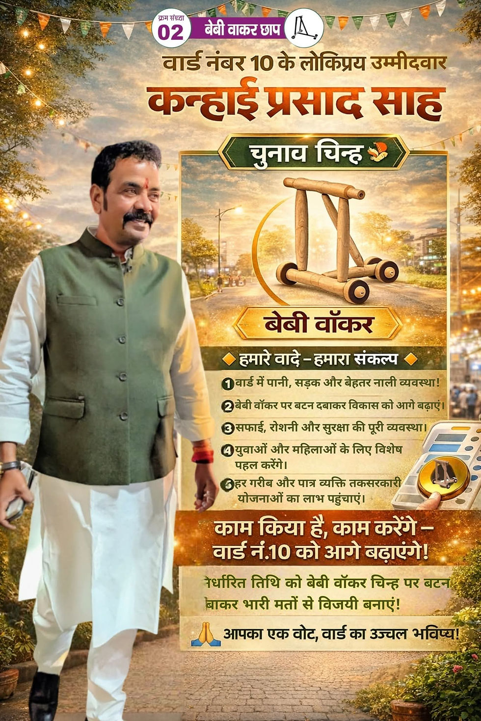 प्रतिदिन वार्ड की दिन में और बस स्टैंड व बाजार की साफ-सफाई रात में कराने, घर-घर में पानी पहुंचाने, दुमका नगर परिषद् से संबंधित सभी आवेदनों का 15 दिनों के अंदर निष्पादन करने की व्यवस्था बहाल करने, बस स्टैंड के सभी दुकानदारों के हित का पूरा ख्याल रखने, फुटकर दुकानदारों को रोजी-रोटी कमाने में किसी भी प्रकार की परेशानी न हो इसके लिए व्यवस्थित ढंग से दुकान लगाने की व्यवस्था करने, शहर में जाम की स्थिति से निजात पाने के लिए पार्किंग व्यवस्था को सुदृढ़ करने, शहर के बिजली तार को अंडर ग्राउंड कराने का प्रयास करने, पूरे शहर को स्ट्रीट लाइट से सजाने, ट्रैफिक व्यवस्था को दुरूस्त करने, शहर के नाली एवं सड़कों को सुदृढ़ करने आदि का संकल्प लिया है।